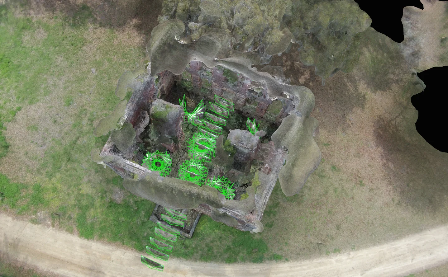 Terrestrial - The camera is close to the subject and is typically hand-held or on a tripod. Here we used this technique to model the interior and exterior up close in order to give finer detail and texture to the final mesh.